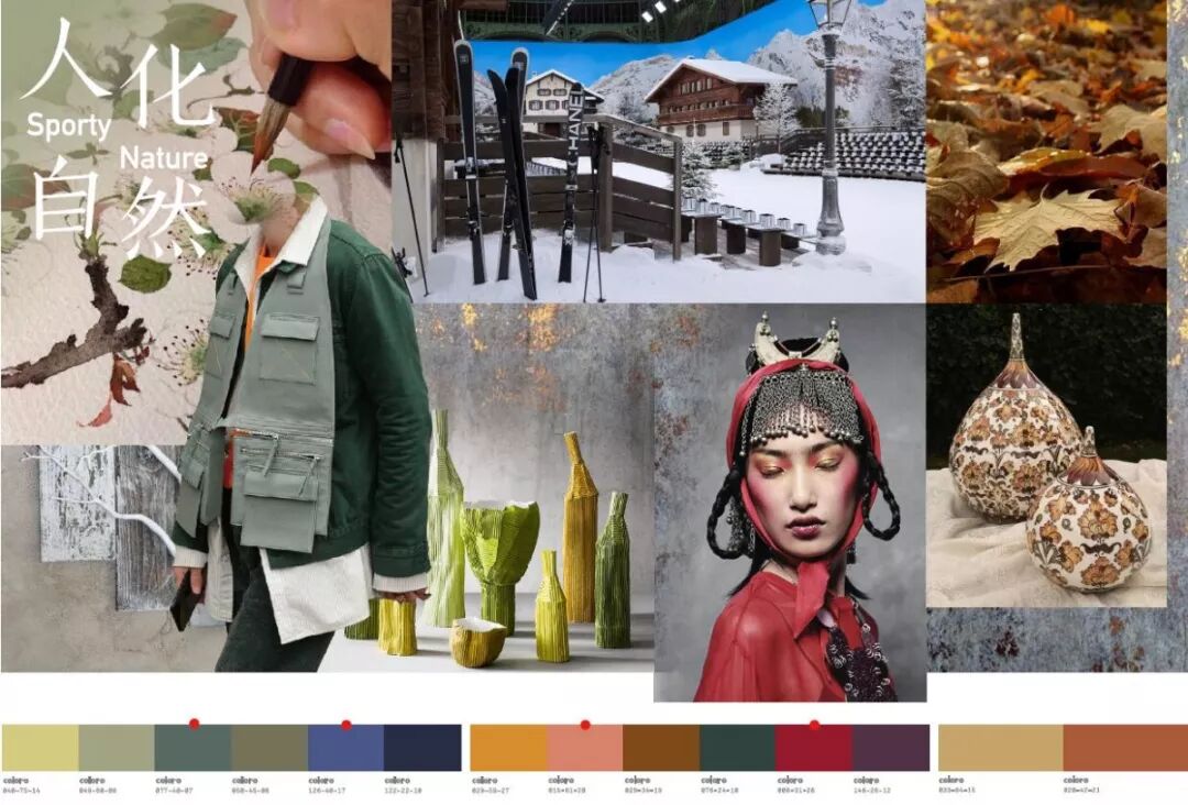 色彩:自然系调色板更新了往季的原始古朴,有机感浅褐色及红木色构成了基础色调,往更精致化的质感方向发展。一组冷蓝调的新卡其色系,茶色、梦石色、青铜卡其色散发着都市化自然感,滑雪灵感的光谱紫及墨蓝色平衡其中。秋季大地色系调和了浓郁浆果色,古老但日常,兼具功能性外观的使用,粉调新肤色作为点缀,焕发自然新意。